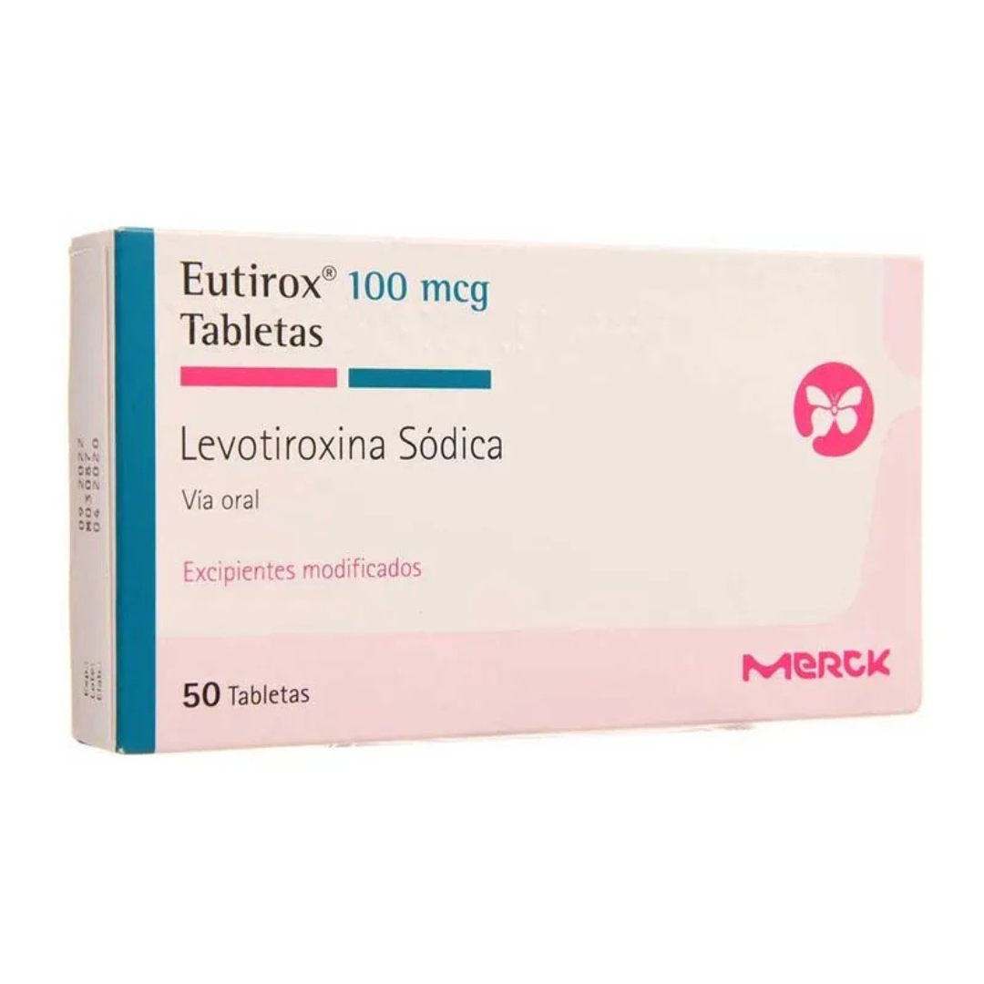 Eutirox 100 mcg contiene levotiroxina sódica, hormona tiroidea sintética indicada para el tratamiento de hipotiroidismo primario y secundario, bocio eutiroideo y como terapia de reemplazo tras tiroidectomía por cáncer de tiroides. Restaura niveles de TSH, normaliza el metabolismo y alivia síntomas como fatiga, aumento de peso e intolerancia al frío. La dosis diaria debe ajustarse y controlarse mediante análisis de TSH.